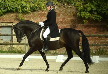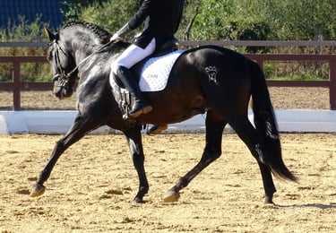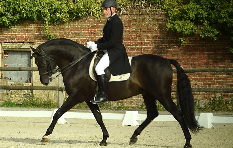 Cet étalon noir (code génétique : ggaaEeCCNN - pas de gêne gris ni de gêne agouti dominants) de 1.65 m, a des allures de dressage avec beaucoup d’amplitude et aucun billardage.