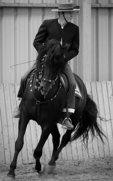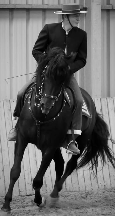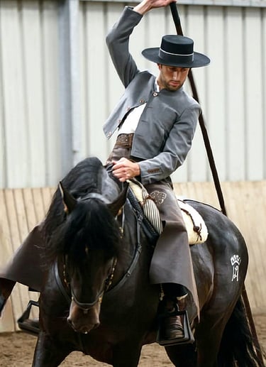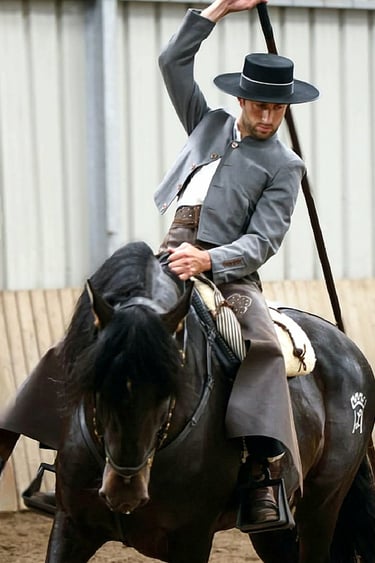 À l'âge de 5 ans, Hijo fait ses débuts en spectacle, démontrant déjà une capacité d'apprentissage rapide. Un an plus tard, il maîtrise l'art de l'équitation à une main avec Franck pour un numéro de garrocha dans un délai remarquable. Quelques mois après, nous introduisons la difficulté de manipuler le feu à ses côtés et HIJO excelle brillamment dans cet exercice.